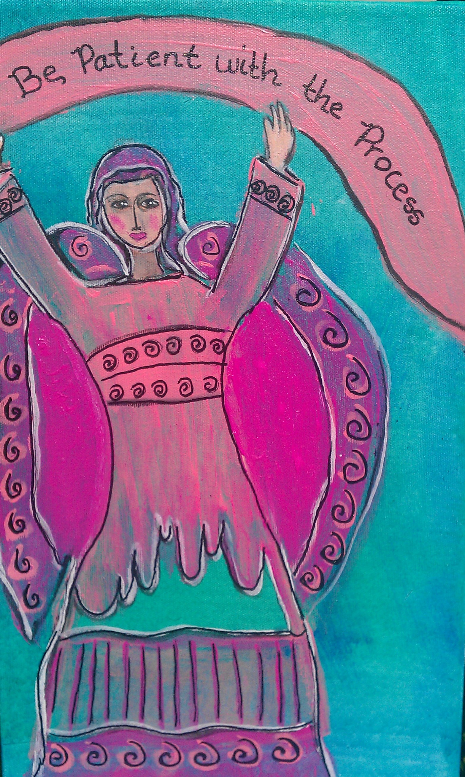 In addition to painting, Mom was a writer. And many of her paintings included words. Sometimes names of the Madonna or angel she was painting–Our Lady of the Sacred Heart, Our Lady of Guadalupe. Other times just uplifting messages, whatever she felt inspired to say.