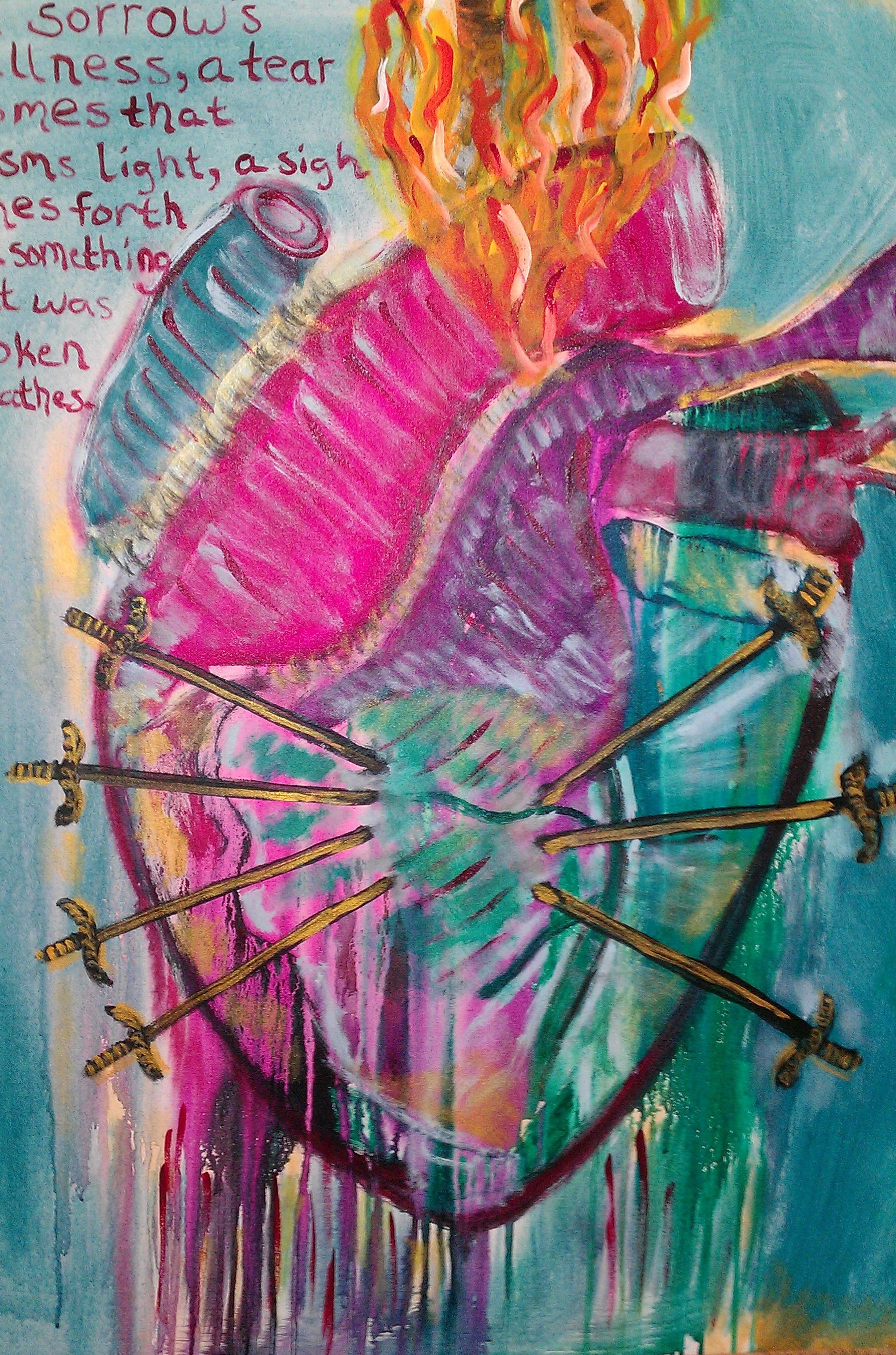 The largest painting, nearly four times the size of the others, was of an anatomical heart, pierced with several spears and bursting with flames.