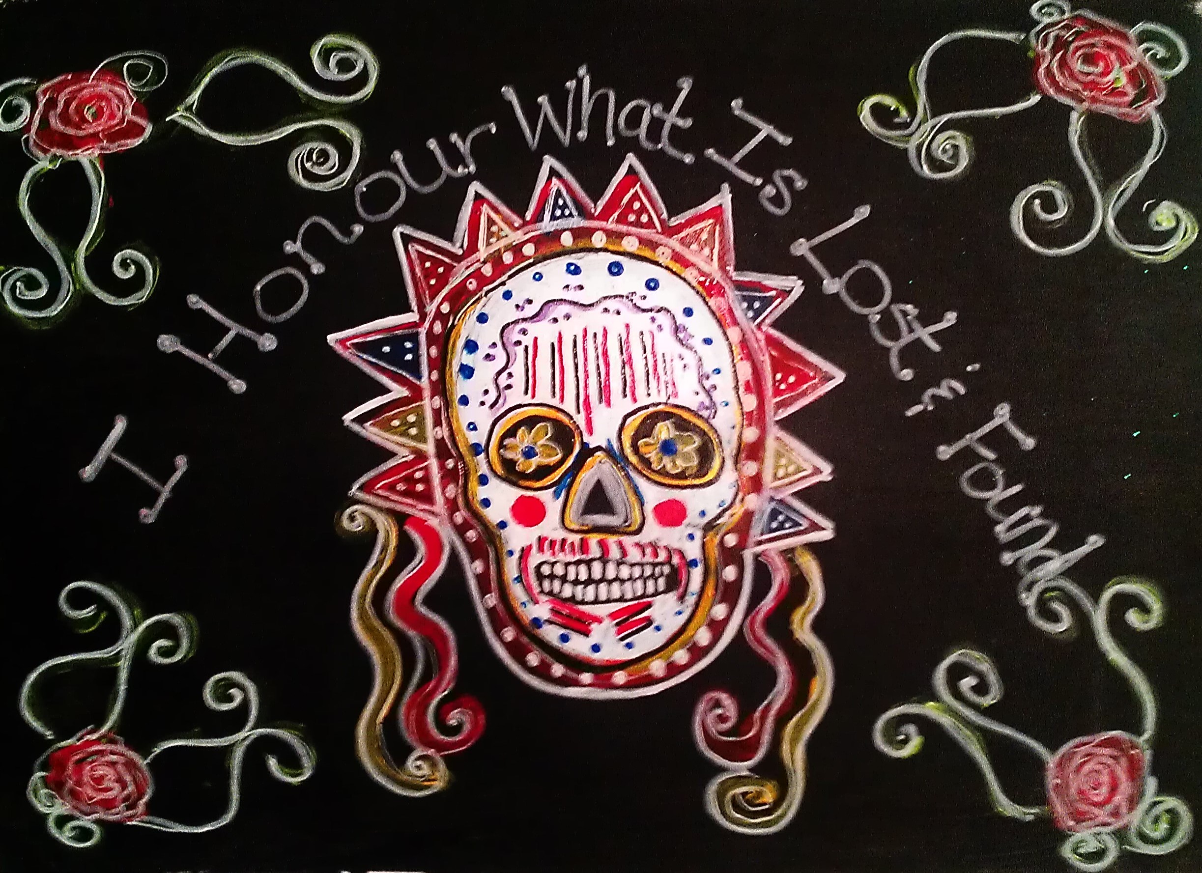 A skull surrounded by roses soothing, “I honour what is lost & found.”